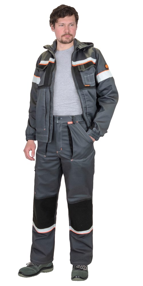 Брюки прямые, на поясе с эластичной лентой по боковым сторонам, с застёжкой на молнию спереди – гульфик, с передними и задними карманами и карманом на правом боковым шве с молнией, с наколенниками. В брюках предусмотрена лента светоотражающая для обозначения сигнальной видимости.