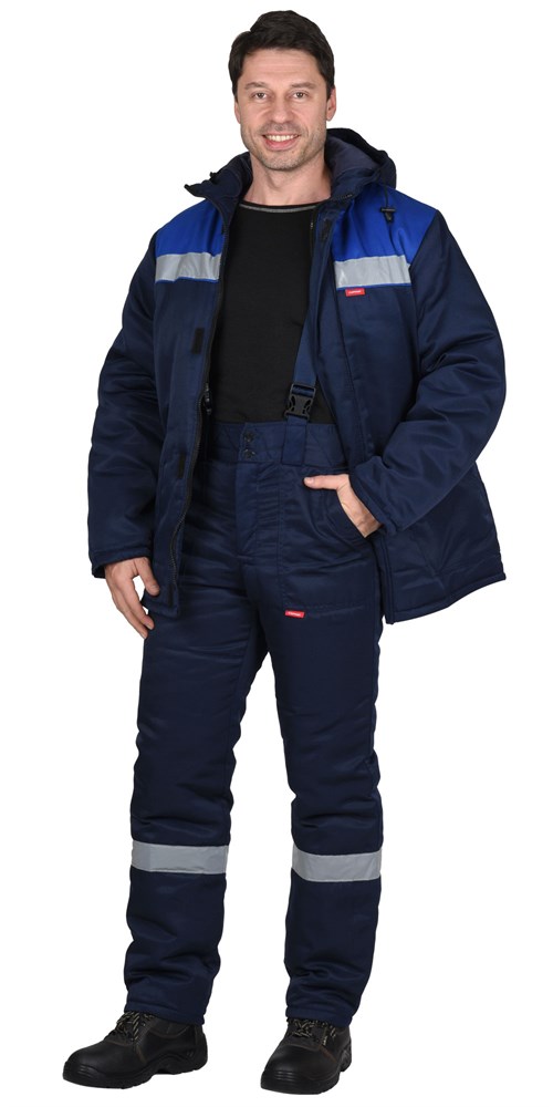 Куртка прямая, с притачной утепленной подкладкой, с центральной застежкой на тесьму-«молния», с притачным капюшоном, с накладными карманами. Рукава втачные. В куртке предусмотрена лента светоотражающая (серая) 50мм для обеспечения видимости.Брюки прямые, с притачной утеплённой подкладкой, с центральной застежкой гульфика на тесьму - «молния», широким фигурным поясом, с застежкой на две обметанные петли и пуговицы, с тремя узкими шлевками на задних половинках и двумя щлевками-держателями фастексов на передних половинках, с боковыми накладными карманами с наклонным входом, с бретелями. В брюках предусмотрена лента светоотражающая (серая) 50мм для обеспечения видимости.