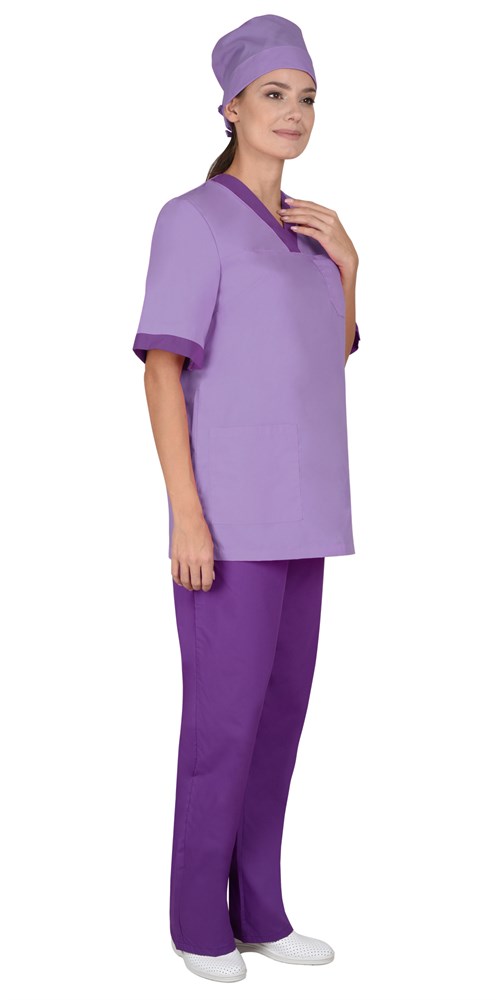 Костюм состоит из блузы, брюк и колпака. Блуза прямого покроя с V-образным вырезом горловины. На полочке один верхний и два нижних накладных кармана. Рукава короткие. Вырез горловины и манжеты рукавов из контрастной ткани. Брюки прямого покроя на резинке. Колпак одноцветный с отворотом.