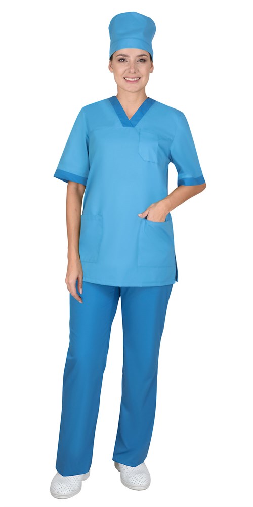 Костюм состоит из блузы, брюк и колпака. Блуза прямого покроя с V-образным вырезом горловины. На полочке один верхний и два нижних накладных кармана. Рукава короткие. Вырез горловины и манжеты рукавов из контрастной ткани. Брюки прямого покроя на резинке. Колпак одноцветный с отворотом.