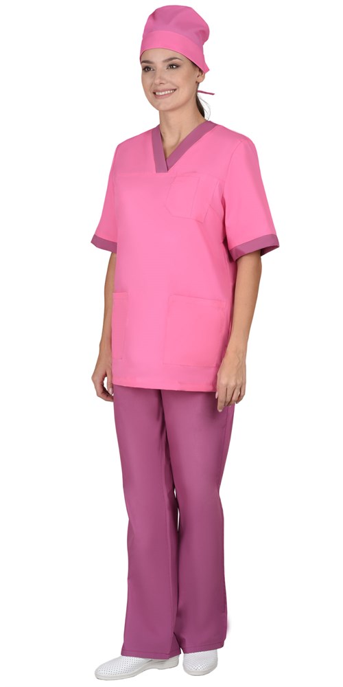 Костюм состоит из блузы, брюк и колпака. Блуза прямого покроя с V-образным вырезом горловины. На полочке один верхний и два нижних накладных кармана. Рукава короткие. Вырез горловины и манжеты рукавов из контрастной ткани. Брюки прямого покроя на резинке. Колпак одноцветный с отворотом.