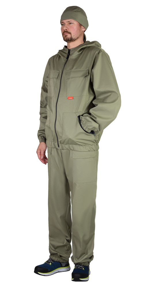 Костюм состоит из куртки и брюк. Куртка укороченная, с центральной застёжкой на молнию, капюшон с утяжкой по лицевому вырезу, верхние накладные карманами с клапанами, застегиваются на потайную липучку, нижние накладные карманы на молнию.