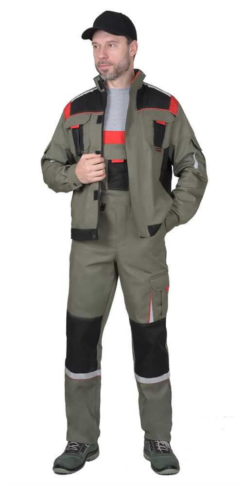 Костюм СИРИУС-СТАН куртка, п/к оливковый с черной и красной отделкой