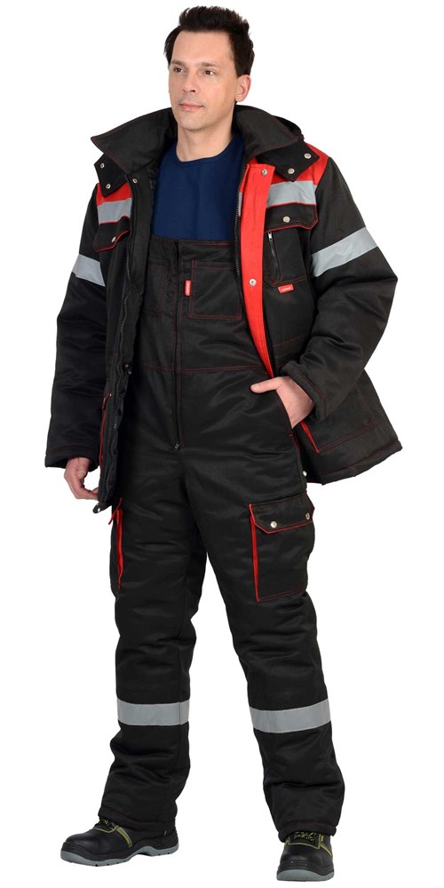 Костюм состоит из куртки и полукомбинезона.Куртка длинная прямого силуэта; с притачной утепленной подкладкой, с центральной застежкой на молнию, с ветрозащитным клапаном, отложным воротником, с верхним накладным фигурным карманом на левой полочке и с верхним прорезным карманом на правой полочке, нижними накладными полуобъемными карманами с фигурным клапаном, застегивающимся на кнопку; с кулисой по линии талии. Полукомбинезон прямой; с притачной утепленной подкладкой, с регулируемыми за счет пряжек - бретелями; с притачным нагрудником; с центральной застежкой на молнию, с нагрудными накладными карманами, с двумя боковыми внутренними карманами, с наклонным входом, с двумя нижними накладными карманами.В костюме предусмотрен СОП ш.50мм для обеспечения сигнальной видимости в условиях пониженной видимости.