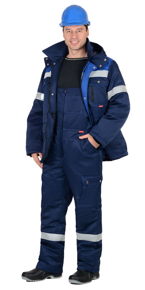 Костюм состоит из куртки и полукомбинезона. Куртка длинная прямого силуэта; с притачной утепленной подкладкой, с центральной застежкой на молнию, с ветрозащитным клапаном, отложным воротником, с верхним накладным фигурным карманом на левой полочке и с верхним прорезным карманом на правой полочке, нижними накладными полуобъемными карманами с фигурным клапаном, застегивающимся на кнопку; с кулисой по линии талии. Полукомбинезон прямой; с притачной утепленной подкладкой, с регулируемыми за счет пряжек - бретелями; с притачным нагрудником; с центральной застежкой на молнию, с нагрудными накладными карманами, с двумя боковыми внутренними карманами, с наклонным входом, с двумя нижними накладными карманами. В костюме предусмотрен СОП ш.50мм для обеспечения сигнальной видимости в условиях пониженной видимости.