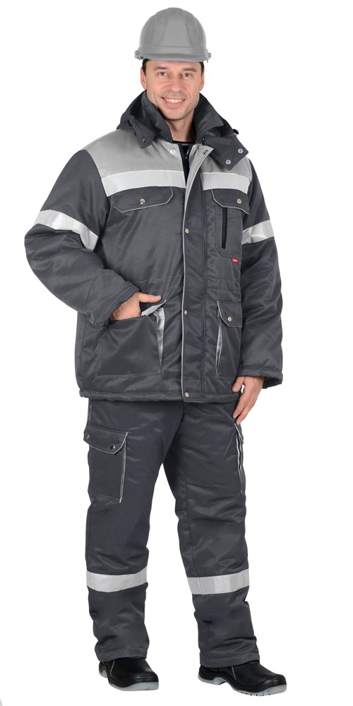 Костюм состоит из куртки и полукомбинезона.Куртка длинная прямого силуэта; с притачной утепленной подкладкой, с центральной застежкой на молнию, с ветрозащитным клапаном, отложным воротником, с верхним накладным фигурным карманом на левой полочке и с верхним прорезным карманом на правой полочке, нижними накладными полуобъемными карманами с фигурным клапаном, застегивающимся на кнопку; с кулисой по линии талии. Полукомбинезон прямой; с притачной утепленной подкладкой, с регулируемыми за счет пряжек - бретелями; с притачным нагрудником; с центральной застежкой на молнию, с нагрудными накладными карманами, с двумя боковыми внутренними карманами, с наклонным входом, с двумя нижними накладными карманами.В костюме предусмотрен СОП ш.50мм для обеспечения сигнальной видимости в условиях пониженной видимости.