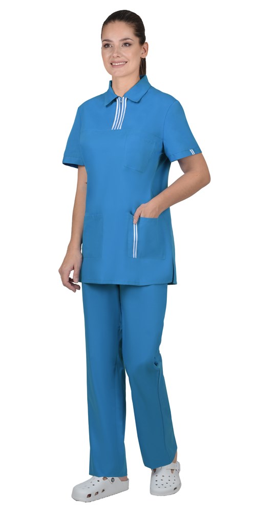 Костюм состоит из блузы и брюк. Блуза прямого силуэта с застежкой на тесьму "молния" в области кокетки. Отложной воротник. Нагрудный левый и два нижних накладных кармана. Рукава втачные, короткие. По низу блузы разрезы в боковых швах.