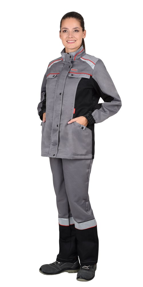Куртка удлиненная; прямого силуэта, с центральной застежкой на молнию, светрозащитной планкой ,застегивающуюся на кнопки.Брюки прямого покроя, с застёжкой спереди на молнию, с притачным поясом, частично стянутым эластичной лентой и застёгивающимся на 1 пуговицу; с 5 шлевками; с двумя боковыми карманами с наклонным входом, с двумя задними карманами.