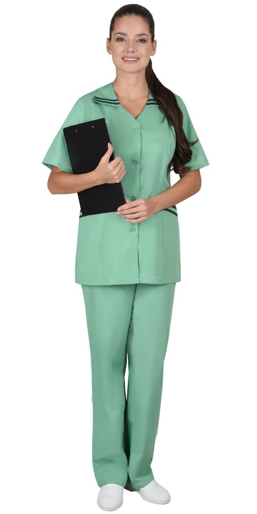 Костюм состоит из блузы и брюк. Блуза приталенного силуэта с застёжкой на пуговицы, короткими рукавами, с отделкой по воротнику и нижним карманам. Брюки прямого покроя без карманов с притачным поясом стянутым резинкой.