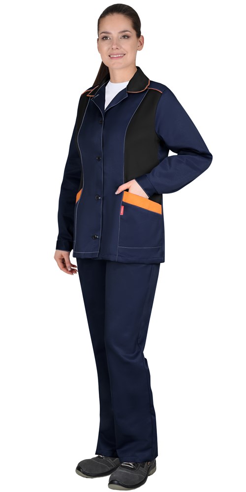 Костюм СИРИУС-ЗОЛУШКА женский, куртка, брюки, темно-синий с черным и оранжевой отделкой
