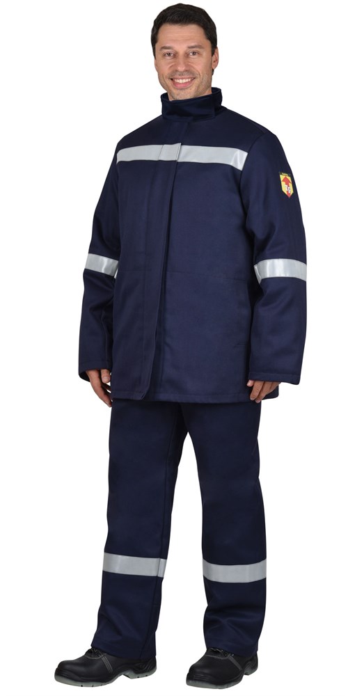 Костюм утеплённый из огнеупорной ткани, состоит из куртки и брюк, на куртке и брюках предусмотрена огнеупорная светоотражающая лента шириной 50мм для обозначения сигнальной видимости.