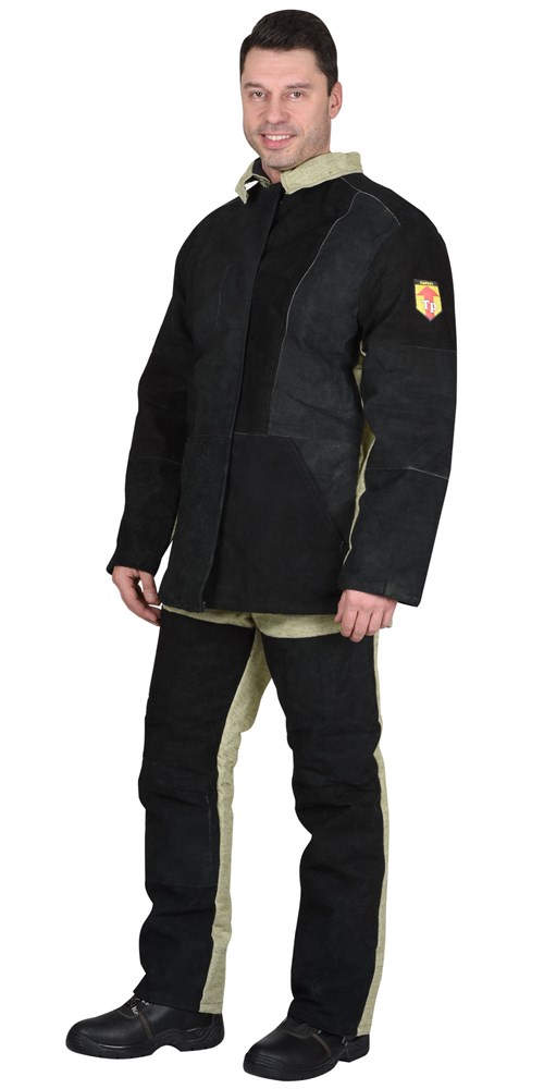 Ткань: брезент ОП, пл. 500 г/кв.м, хаки. Накладки: спилок КРС , толщина 1,0-1,3 мм. Утеплитель: ватин, состав6 х/б,2 слоя, пл. 300 г/кв.м. Подкладка: бязь, состав: 100 х/б. Куртка, брюки со съемным утеплителем. Куртка с потойной застежкой на пуговицы, карманами в боковых швах. Воротник отделан бязью. Рукава с напульсниками. Брюки с застежкой в боковых швах. ГОСТ Р 12.4.250-2013 ССБТ, ГОСТ Р 12.4.236-2011