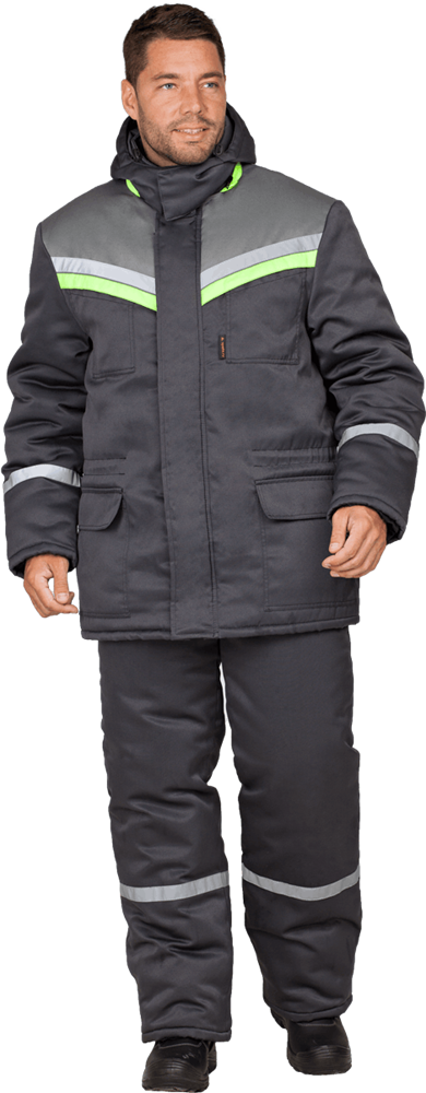 Костюм состоит из куртки и брюк. В костюме используется световозвращающая полоса