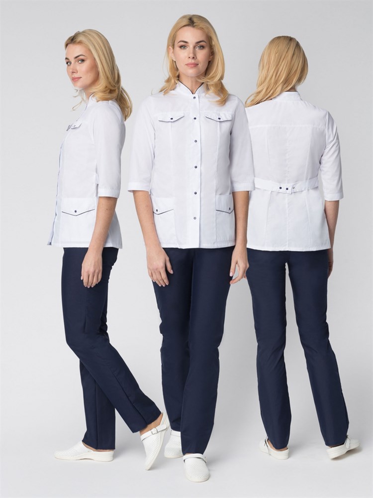 Модная спецодежда для женщин «Орхидея» подчеркивает изящность и утонченный вкус каждой сотрудницы медицинского учреждения, салона красоты, массажного кабинета или стоматологии. Костюм женский рабочий состоит из двух предметов: блуза + брюки женские. Спецодежда изготовлена в соответствии с ГОСТ, надежно защищает от общих производственных загрязнений. Удлиненная блузка полуприталенного силуэта подчеркивает фигуру, не стесняет движения и регулируется по линии талии с помощью вшивного пояса на кнопках. Для хранения мелочей предусмотрены боковые карманы с клапанами. Прямые рабочие брюки оснащены поясом на резинке для комфортной работы в течение длительного периода времени. Лаконичный и современный внешний вид костюма обеспечивают контрастный дизайн, нагрудные декоративные карманы и синие канты на воротнике и карманах, идеально гармонирующие с синими брюками.