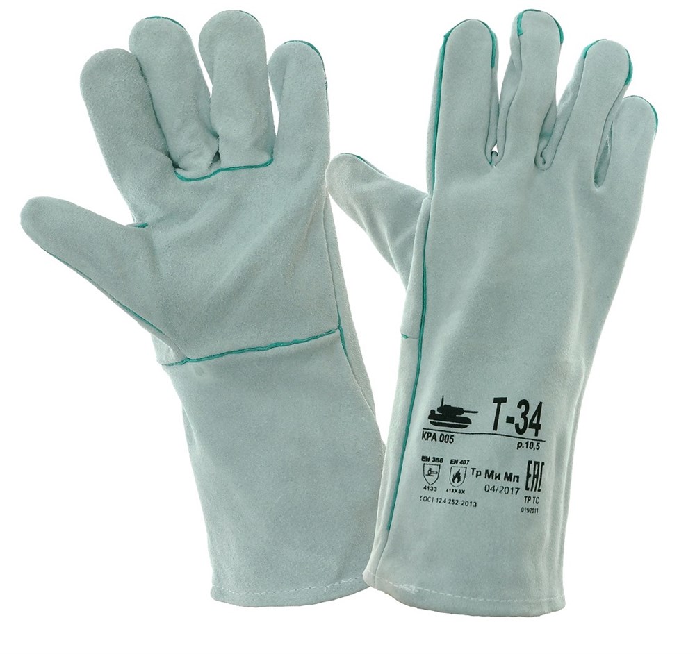 Перчатки сварщика (краги) Т-34 спилковые серые без подкладки предназначены для защиты рук от механического воздействия (истирание, прокол, порез), искр и брызг расплавленного ме-талла и работ в условиях повышенных температур. Краги изготовлены из качественного шлифованного кожевенного спилка крупного рогатого скота сорта АВ. Швы прошиты усиленными нитками и усилены вставками из кожи зеленого цвета. Внутри краги имеется вшивной ярлык с дополнительной информацией о продукции.