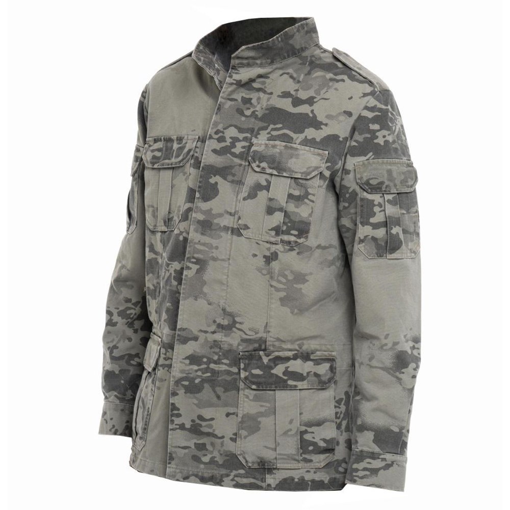 Куртка мужская из хлопка "YUMCO", модель A2200414M выполнена на пуговицах, закрытых ветрозащитной планкой. Изделие оснащено 12 карманами. Внешние: 2 на рукавах, 2 на груди, 2/2 на талии (накладной + прорезной). Внутренние: 2 нагрудных на молнии и 2 на поясе на липучках. На модели расположен воротник-стойка.