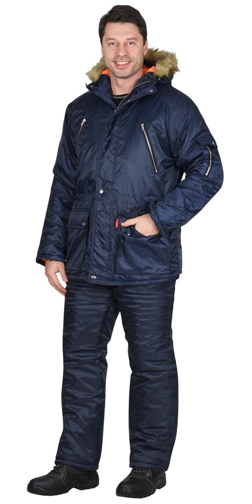 Куртка удлинённая, утеплённая, прямого силуэта с рукавами реглан, втачным утеплённым капюшоном, с центральной бортовой застёжкой на металлическую молнию, ветрозащитным клапаном, застёгивающимся на 4 кнопки. Куртка с верхними прорезными карманами на «молнии» и нижними двойными накладными карманами с объёмами с клапанами на кнопках. Рукава с внутренними трикотажными напульсниками. Объём куртки по талии и низу регулируется при помощи шнура и фиксаторов.
