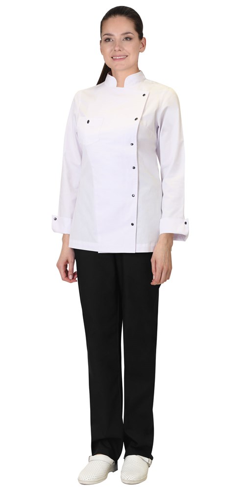 Куртка типа жакет полуприлегающего силуэта с длинными рукавами. Втачной воротник стойка. Сквозная смещённая бортовая застёжка на кнопки. Спинка с отрезными бочками, со вставкой из трикотажной сетки (для циркуляции воздуха). По низу рукавов притачные отложные манжеты застегивающиеся на кнопку.