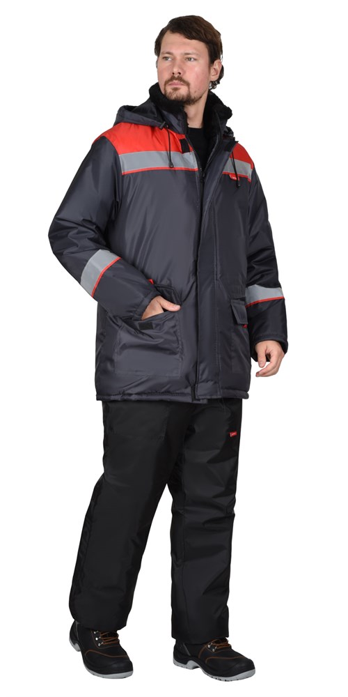 Куртка СИРИУС-БРИГАДИР зимняя мужская с мех. воротником и капюшоном, темно-серая с красным