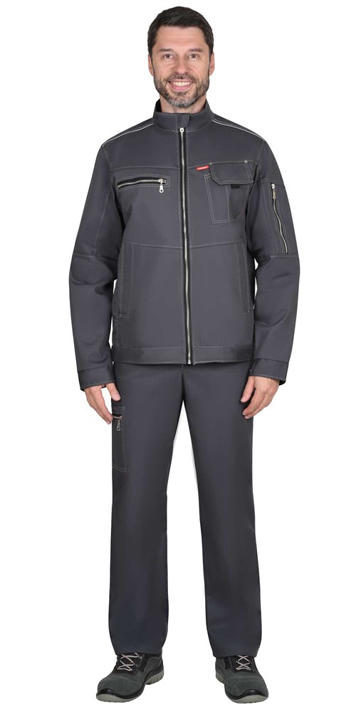 Куртка прямого силуэта, с центральной застежкой на металлическую молнию, с нагрудным накладным и прорезным, застегивающимся на молнию, карманами, нижними внутренними карманами с листочками. Пояс и манжеты рукавов регулируются по ширине патами и кнопками. Воротник "стойка".