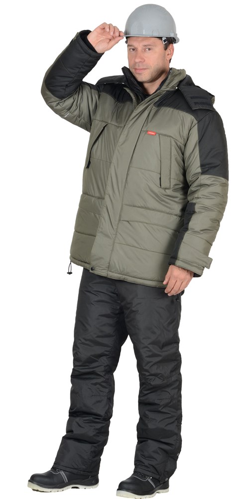 Куртка прямого силуэта; с горизонтальными строчками настрачивания слоя утеплителя на детали полочек, спинки, рукавов; воротник - «стойка»; с тесьмой «молния» по горловине, скрытой под планкой, для пристёгивания капюшона; с центральной бортовой застёжкой на двухзамковую тесьму «молния» и двумя внешними ветрозащитными клапанами, застёгивающимися на 4 текстильные застёжки «липучки» длиной 9,5см и одну кнопку, по низу планки; с внутренним ветрозащитным клапаном правой полочки (от верхнего края воротника до низа куртки), из ткани подкладка.