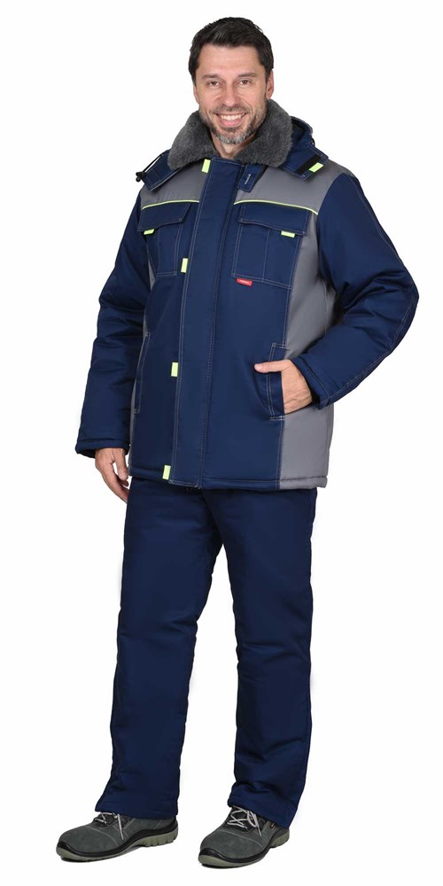 Куртка СИРИУС-ФАВОРИТ удлиненная, мех. воротник, т-синяя со ср.серым и лимонным кантом