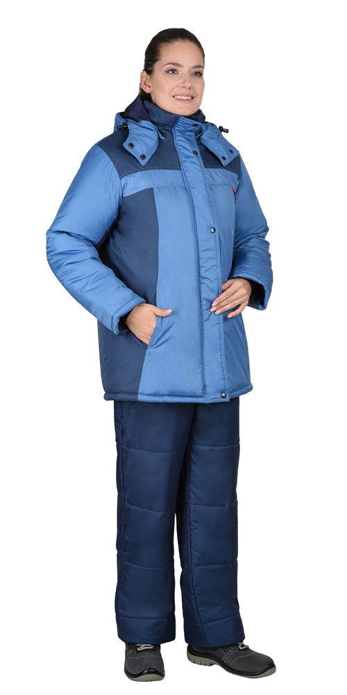 Куртка женская, прямого силуэта, с притачной утеплённой подкладкой, с центральной бортовой застёжкой на двухзамковую тракторную тесьму «молния» и внешним ветрозащитным клапаном с 5-ю кнопками; с воротником «стойка» и съёмным утеплённым капюшоном; с боковыми карманами в рельефных швах.