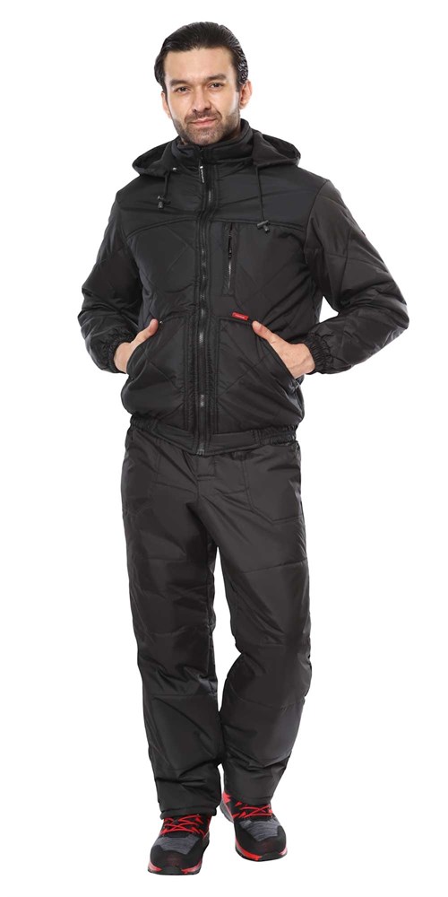 Куртка утеплённая, укороченная, по низу на притачном поясе с эластичной лентой, на подкладке из флиса, со съёмным капюшоном, с центральной бортовой застёжкой на молнию и воротником стойка. Изделие с верхним нагрудным прорезным и нижними накладными карманами. Рукава втачные с притачными манжетами, манжеты частично стянуты на эластичную ленту. Полочки, спинка, рукава и нижние карманы куртки выстеганы с утеплителем в виде ромбов.