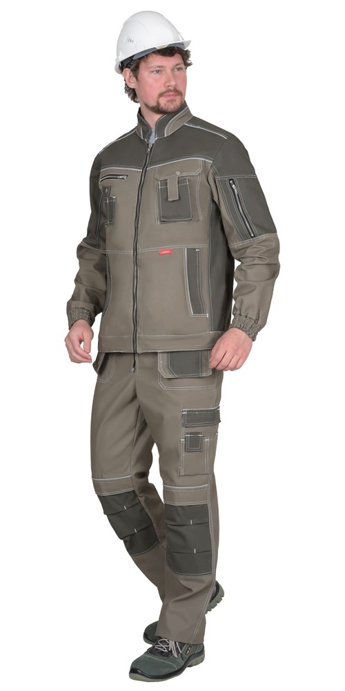 Куртка выполнена из ткани "Канвас Комфорт", прямого силуэта, с центральной застежкой на металлическую молнию, воротником - "стойкой", с различными многофункциональными карманами. Рукава втачные, левый с накладным карманом с застежкой на металлическую молнию, с притачными манжетами, частично стянутыми резинкой. В куртке предусмотрен кант СВ 3мм светоотражающий 100 К для обозначение видимости. На средней части левой полочки выполнены 2 кармана, настроченные один на другой с фигурным клапаном, застегивающимся на 1 кнопку. На средней части правой полочки в шве кокетки прорезной карман, в рамку, застегивающийся на металлическую молнию и накладной карман, разделенный на три секции с патой на кнопку. Нижние части полочек с прорезными карманами в листочку с наклонным входом. Воротник – стойка с кантом СВ 3мм. Пояс фигурный формы.