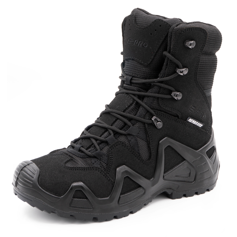 Серия обуви E-PRO — это одна из самых популярных в туристической и тактической обуви, используемая походниками, альпинистами, спортсменами, военными и сотрудниками правоохранительных органов. Линейка E-PRO Special представлена целым семейством моделей, отличающихся по цвету, высотой берца, а также наличием мембраны. Основной материал изготовления — высококачественная замша со вставками из кордуры. Наличие подкладки из мембраны делает обувь непромокаемой и одновременно дышащей, способной отводить испарения с поверхности стопы. Подлитой носок обеспечивает защиту от повреждений. Защитный рант с выборками для облегчения веса проходит по всему периметру и создает узнаваемый образ. Кроме основных функций рант дает дополнительное сцепление с поверхностью, например, при движении вдоль склона. Высота среднего ботинка 14.5 см, этого хватает для отличной фиксации голеностопа. Все детали прошиты двойным швом, все швы сделаны крайне аккуратно. На пятке есть петелька, облегчающая надевание. Подошва имеет многослойную структуру. Промежуточный слой из полиуретана придает высокие амортизирующие свойства; ходовой слой из резины на основе натурального каучука делает подошву более износостойкой и способствует хорошему сцеплению с грунтом и другими плоскостями. Язычок с защитным клапаном исключает просачивание воды и попадание посторонних предметов внутрь.-