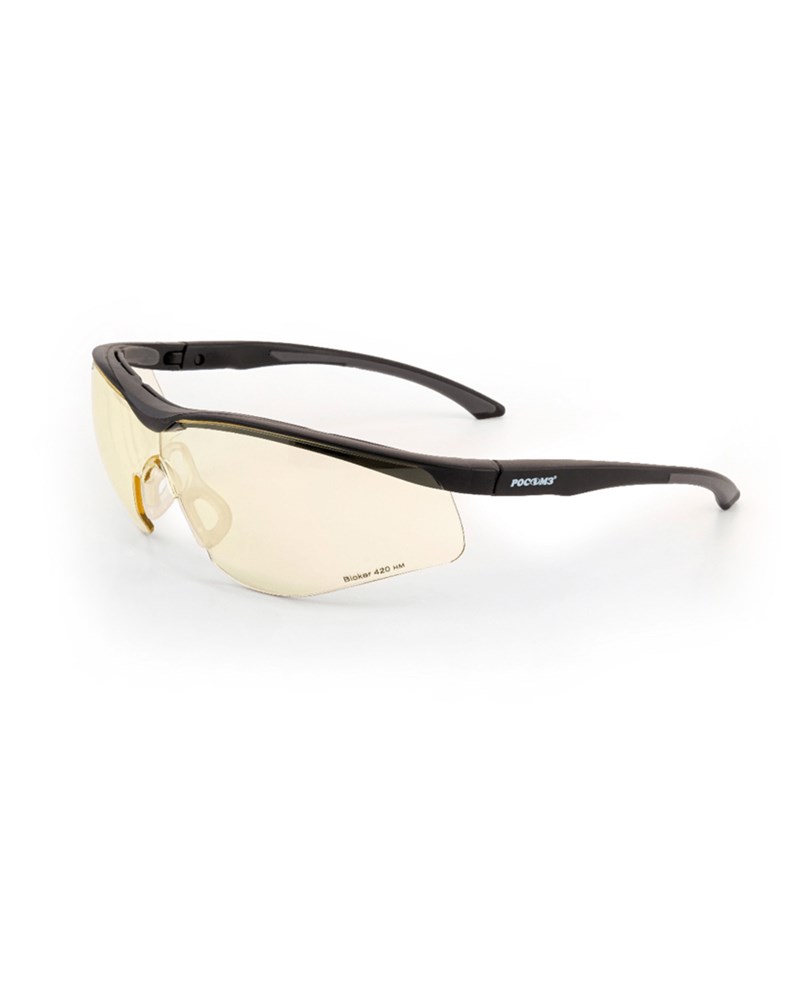 СИЗ глаз для защиты от механических воздействий и неионизирующих излучений, капель и брызг жидкостей. Очки открытые с мягкой вставкой из ТЭП в области лба, двухкомпонентными регулируемыми по углу наклона заушниками с мягкими вставками из ТЭП защищают от высокоскоростных летящих частиц с низкоэнергетическим ударом 0,84 Дж.