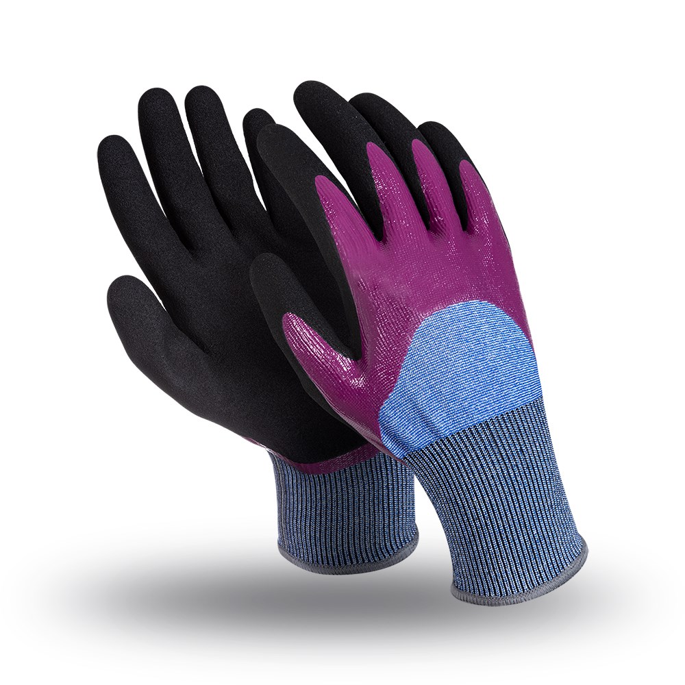Покрытие 3/4 из комбинированного гладкого и микрогранулированного (песчаного) нитрила — надежный захват предметов в агрессивных средах (Нс, Нм); высокий уровень защиты от истирания