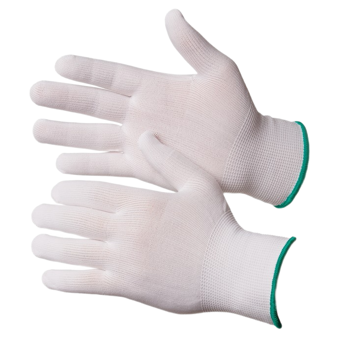 Чистые перчатки из белой нейлоновой пряжи. Бесшовная основа 13го класса вязки прекрасно вентилируется и не оставляет ворсинок. Универсальны, применяются для любых механических работ. Двойной оверлок с латексным кольцом обеспечивает превосходную фиксацию перчатки на запястье.Цветная индикация размера по оверлоку.