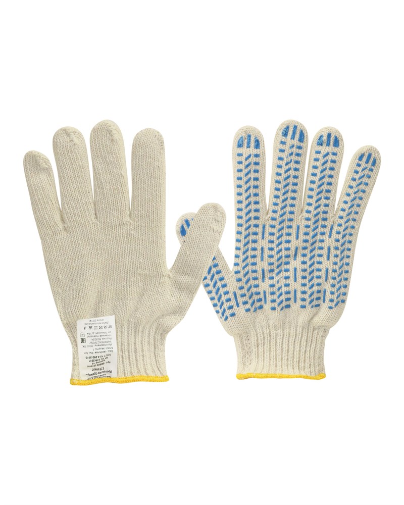 изготовлены из хлопка с добавлением п/э, а точечки на контактной поверхности из специального полимерного материала. Покрытие из ПВХ позволяет крепко удерживать в руках скользящие материалы, структура покрытия не позволяет предмету вылететь или выскользнуть из руки. .