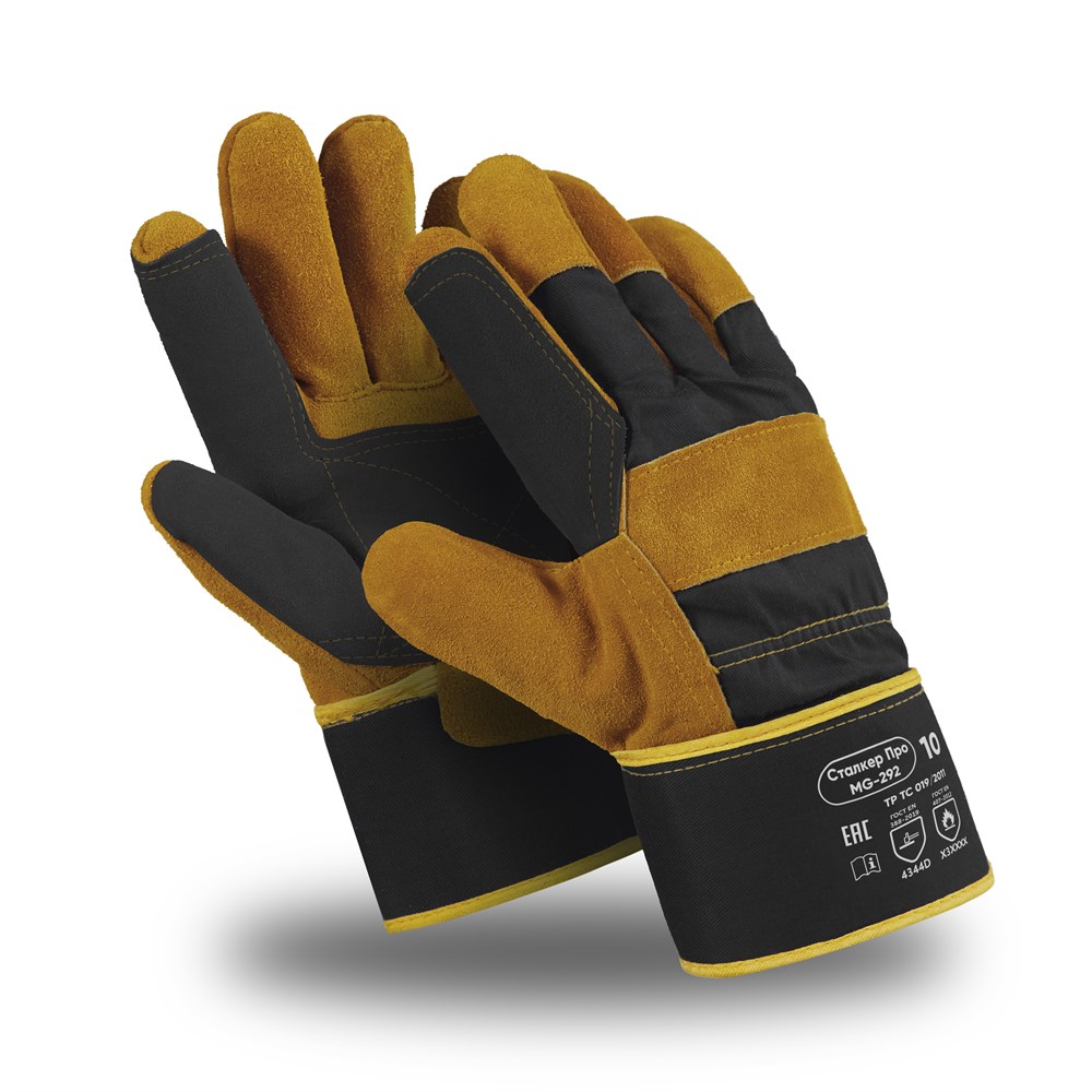 Перчатки СТАЛКЕР ПРО (MG-292), спилковые комбинированные, усиленные, крага, цвет коричнево-синий