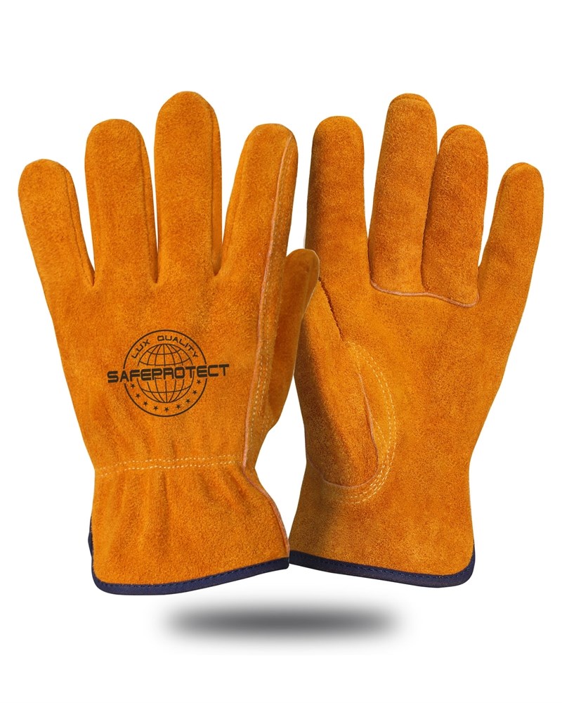 Перчатки УРАЛ цельноспилковые для защиты от механических воздействий (истирание, прокол, порез) и пониженных температур. Спилок КРС, сорт АВ (1,4+/– 0,2 мм), шлифованный, желтого (золотого) цвета, двойные швы. На запястье резинка. Утеплитель – искусственный желтый мех.