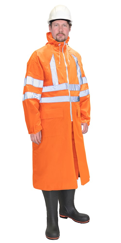 Плащ изготавливается из прочной плащевой ткани ярко-оранжевого цвета с ПВХ покрытием. Вес ткани — 225 гр./метр.кв.