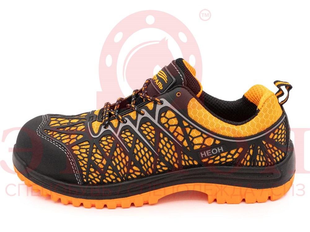 Кроссовки «МИСТРАЛЬ НЕОН» выполнены из дышащего водоотталкивающего трикотажного материала с накладками из ТПУ для дополнительной прочности и защиты. Подкладка кроссовок выполнена из текстильного воздухопроницаемого полотна с крупной ячейкой, что обеспечивает хорошую вентиляцию и комфорт. Подносок кроссовок укреплен и изготовлен из поликарбонатного материала (Мун 200 Дж) для защиты ноги. Подошва кроссовок двуслойная, выполнена из полиуретана и термополиуретана (ПУ-ТПУ) для комбинации комфорта и прочности. Стелька кроссовок антипрокольная, выдерживает нагрузку до 1200Н и обеспечивает защиту от проникновения острых предметов. Для безопасной работы сотрудника в местах с плохим освещением на кроссовках «МИСТРАЛЬ НЕОН» расположены световозвращающие элементы.