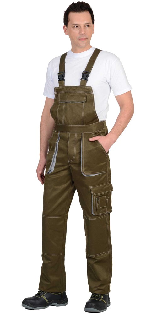 Полукомбинезон - прямой с контрастной отделкой, с бретелями, с застёжкой спереди и с застёжкой в правом боковом шве на три петли и три пуговицы. Полукомбинезон с различными многофункциональными карманами, спинка с частичной стяжкой по талии для лучшего прилегания по фигуре.