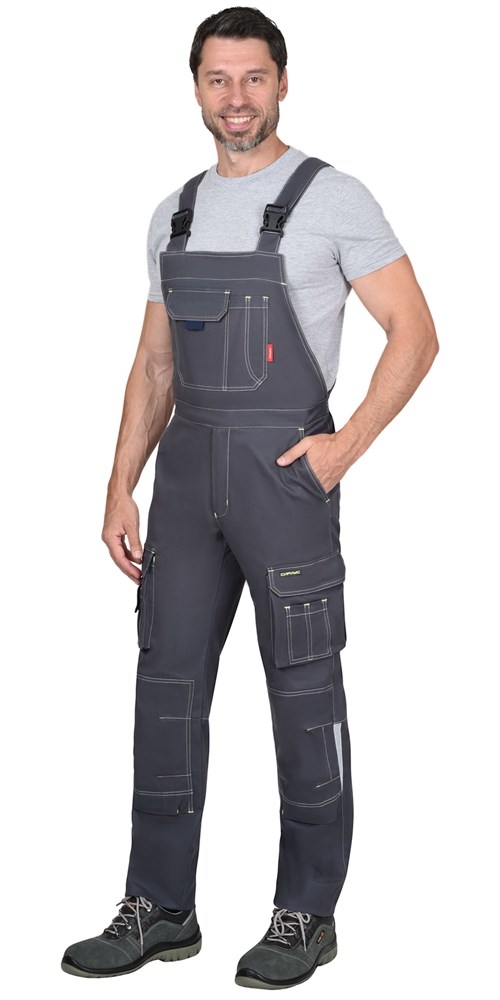 Полукомбинезон полуприлегающего силуэта с контрастной отстрочкой, бретелями, с застежкой гульфика на молнию YKK и застежкой в боковом шве на пуговицу и кнопку. Бретели регулируются при помощи застежек-фастексов и резинки. Нагрудник с накладным фигурным трехсекционным карманом и фигурным клапаном на липучке. Изделие с нижними боковыми внутренними карманами с наклонным входом, с накладными объемными карманами и фигурным клапаном на липучке на боковых швах. Полукомбинезон с объемными наколенниками с карманом для амортизационных накладок и застежкой на липучке по нижнему краю.