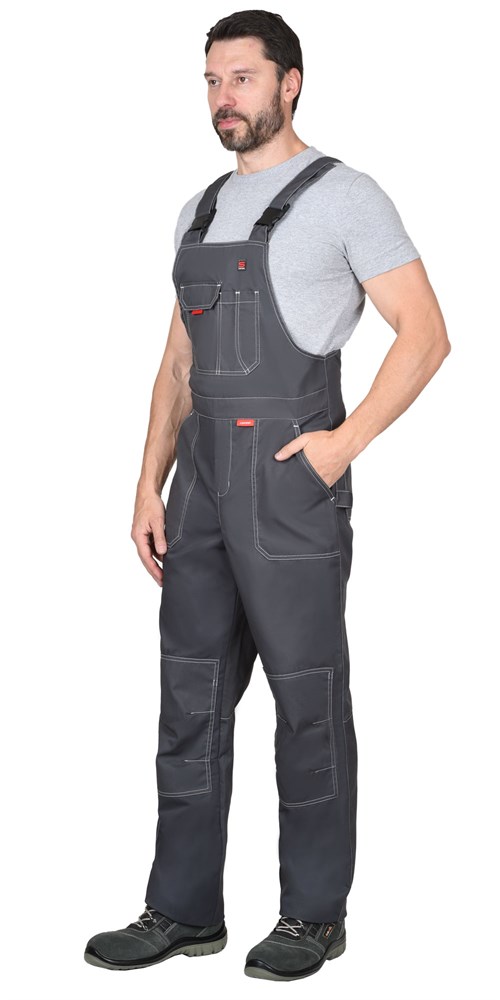 Полукомбинезон с застежкой спереди на однозамковую тесьму молния и в правом боковом шве на три обметанные петли и пуговицы; с различными многофункциональными карманами, объемными наколенниками; с регулируемыми за счет эластичной ленты и фастексов бретелями; с эластичной лентой по спинке, для лучшего прилегания.