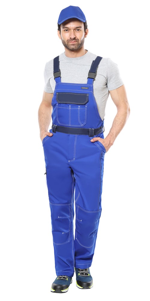 Полукомбинезон двухцветный, с застёжкой спереди - гульфик с молнией и с застёжкой в правом боковом шве на пуговицы, с наколенниками, с бретелями. Полукомбинезон спереди с боковыми внутренними карманами и нагрудным карманом с клапаном, на липучке. Сзади полукомбинезон по талии стянут резинкой для лучшего прилегания по фигуре, на правом боковом шве на уровне колена карман с молнией. Бретели с резинкой, длина бретелей регулируется застежкой-фастексом.