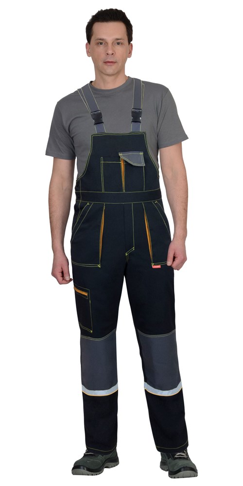 Полукомбинезон прямой, с застежкой спереди на молнию – гульфик и в правом боковом шве на пуговицы, с нагрудными, передними, задними карманами и карманом на правом боковым шве с молнией, с наколенниками, спинка с частичной стяжкой по талии, бретели регулируются при помощи застежек-фастексов и резинки. В полукомбинезоне предусмотрена лента светоотражающая для обозначения сигнальной видимости.