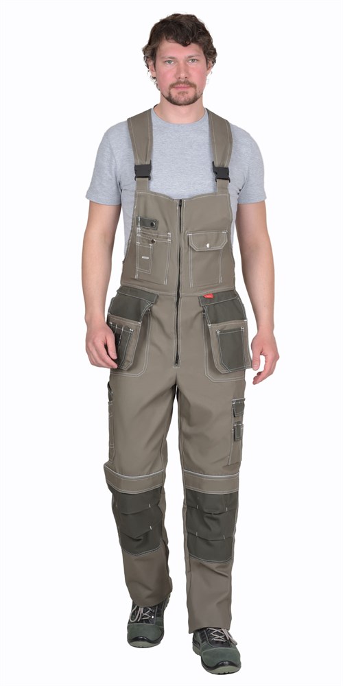 Полукомбинезон выполнен из ткани "Канвас Комфорт", прямого силуэта, с центральной застежкой на тесьму – «молния» R-вида, с различными многофункциональными карманами, с кулисой по спинке на резинку ткацкую, с объёмными наколенниками и бретелями регулируемыми резинкой помочной и фастексам. В полукомбинезоне вшивается кант СВ 3 мм светоотражающий 100 К для обозначение сигнальной видимости.
