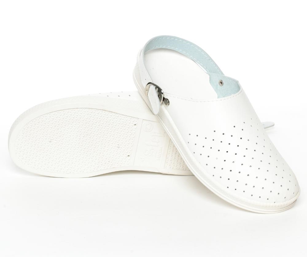 Перфорированная кожа в мужских сабо создает дополнительную вентиляцию. Поворотный регулируемый ремешок может располагаться спереди и сзади, для фиксации пятки и декоративного элемента на изделии. Удобная модель предназначена для использования в сфере обслуживания, легкой промышленности, медицины.