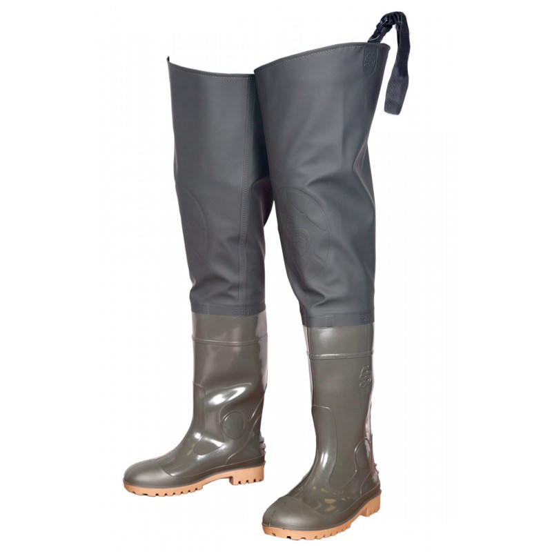 Сапоги ПВХ рыбацкие регулируются по длине на бретелях. Верхняя часть герметично соединена с сапогами. Модель изготавливается на базе рабочих сапог. Изделие полностью водонепроницаемо. Наколенники выполнены из винтитола и поролона. На заказ сапоги могут быть изготовлены с металлическим защитным носком (Мун 200) и проколозащитной металлической стелькой (1200 Н).