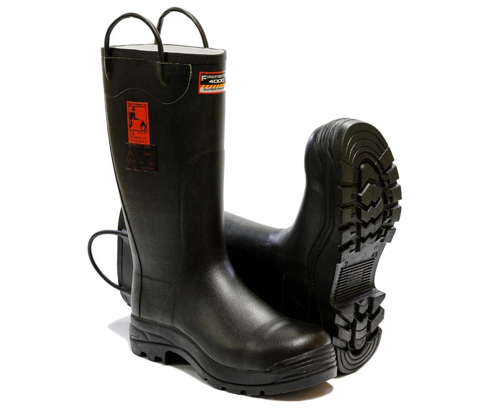 CENTURY® Firefighter 4000 Knee Tigar обладают высокими защитными свойствами. Сапоги водонепроницаемые, масло-бензостойкие, жаропрочные, устойчивые к многократным изгибам. Изделие защищает от ударов в носочной части. Подошва предотвращает скольжение ноги. Удобная колодка обеспечивает комфорт в носке. Шнуровка сзади сверху необходима для регулировки голенища. Петли на голенище для быстрого одевания. Высота сапог составляет 40 см. CENTURY® Firefighter 4000 Knee Tigar могут использоваться на поверхностях с повышенными температурами, с риском прокола подошвы, на скользких участках, в условиях повышенной влажности, при работе с маслами и смазками, в условиях общепроизводственных загрязнений. Средство индивидуальной защиты, применяется при тушении пожара, при риске поражения электрическим током. Резиновые сапоги британских пожарных помимо водонепроницаемых свойств обладают также и огнеупорными (огнестойкими) качествами. Данная модель отличается от Firefighter 3000 большей плотностью резины.
