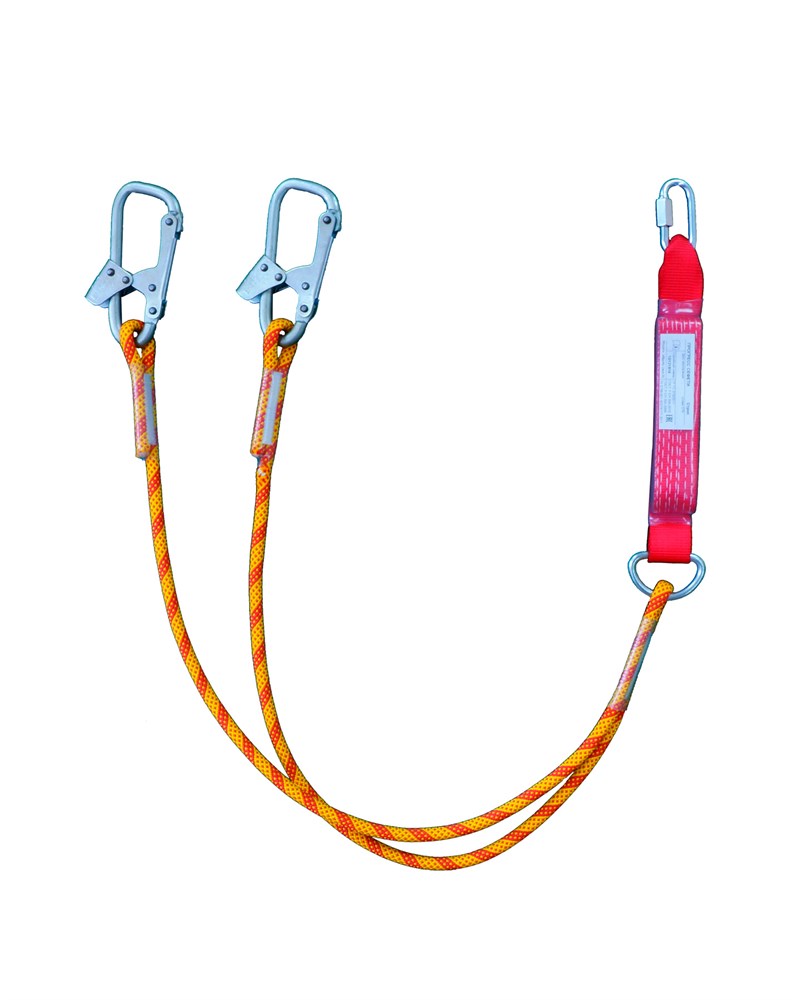 Строп аВд+Кс - страховочный двойной (двуплечий) строп из полиамидного каната с амортизатором, двумя монтажными и одним соединительным карабином.