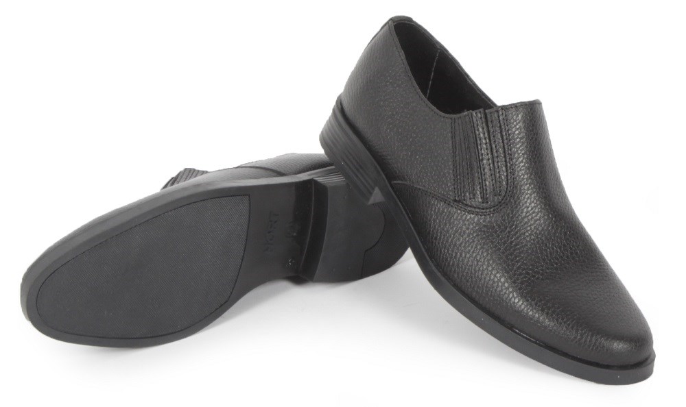 Туфли форменные на резинке. Выполнены из натуральной кожи с теснением. Подносок и задник усилены термопластом. Подошва ТЭП (+40 -40). Метод крепления клеевой.