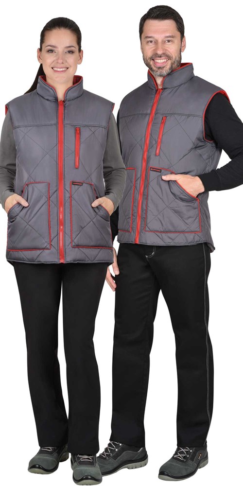 Утеплённый стёганый жилет прямого силуэта с центральной застёжкой-молнией. Подкладка из флиса, воротник-стойка, нагрудный карман на молнии и нижние фигурные утеплённые карманы. Удлинённая спинка. Соответствует ГОСТ 25295-2003.